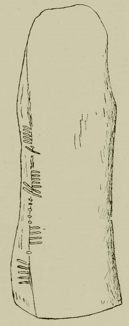 Condition: The ogham stone is roughly rectangular in profile and narrows towards the top. Sections of the inscription appear to have been damaged by flaking or abrasion of the stone surface, and in parts the sharpness of the corner has been somewhat rounded by use of the stone as a scratching post by farm stock (Archaeological Survey of Ireland, Field Report 2017). The inscription is also quite weathered and some characters are unclear due to damage. For example, Macalister (1945, 8-9) read the initial character as a Q but only 4 scores, at most are evident. Four of the expected five notches of the final I in the personal name survive. Although there is no trace on the stone, a final I in MAQI may have been lost, as suggested by Macalister (1945, 9).