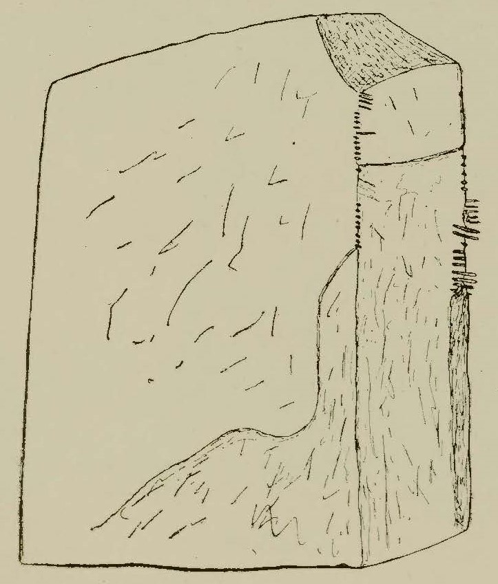 Letters: The inscription is pocked with large, somewhat unevenly spaced consonant strokes of up to 8cm long where they survive and shorter (1.5-2cm) vowel strokes, which are more evenly spaced.