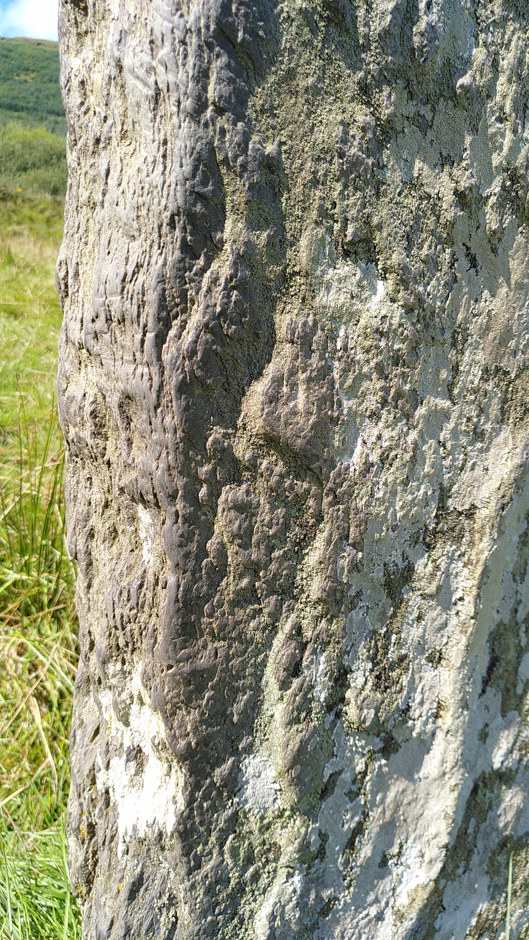 Text field: A rectangular stone with the long axis NNW-SSE. As Macalister (1945, 72) noted, the inscription is found ‘low down on the dexter angle of the face turned away from the road’.