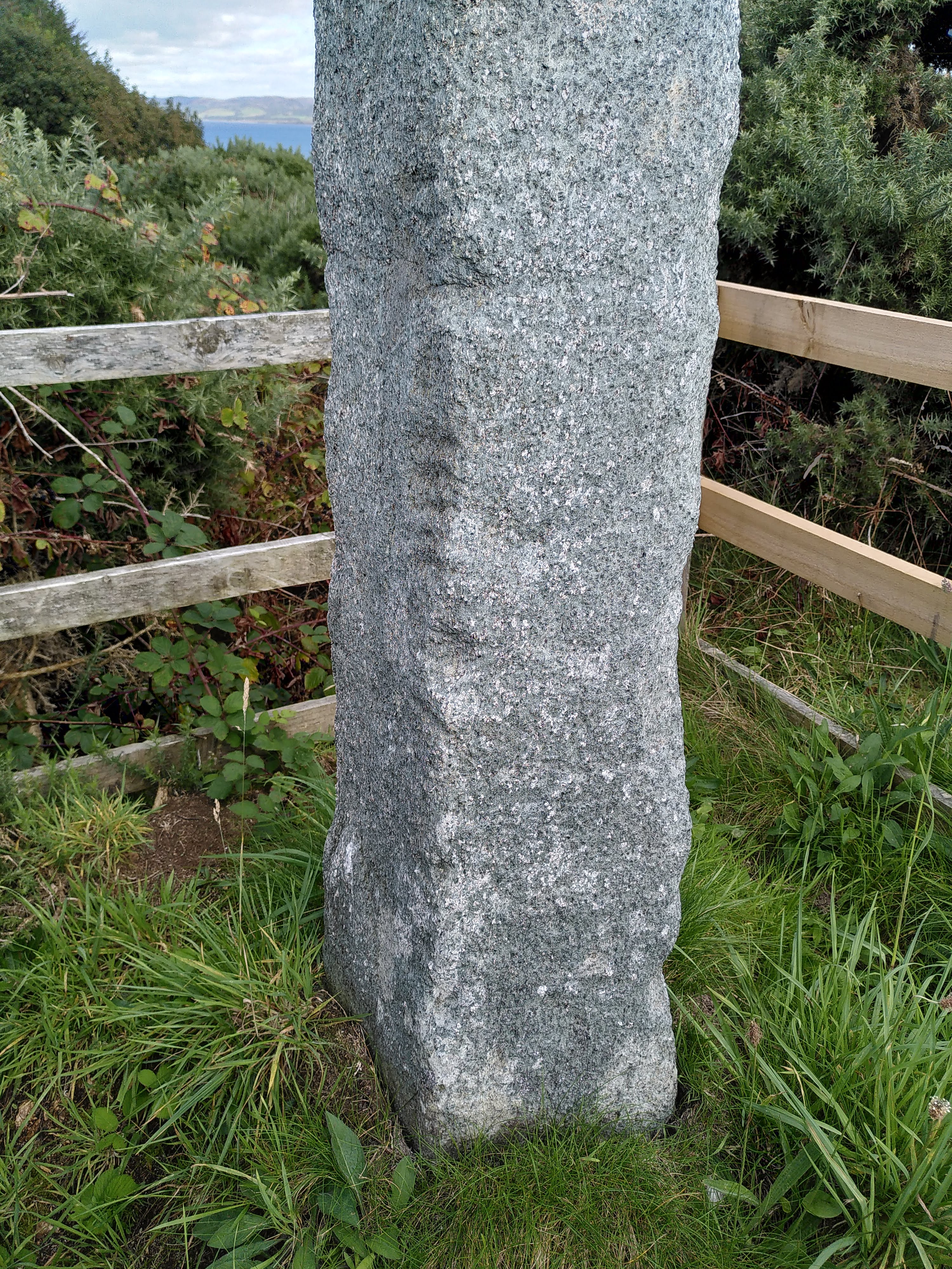 Condition: A tall, square-shaped pillar, it ‘is unclear whether the monument is a re-used pre-historic standing stone or a pillar specially erected for the bearing of the inscription’ (Forsyth 1996, 289). ‘The stone has fallen and been re-erected at least twice’, the first time it was intentionally toppled by some young men while the second fall was as a result of quarrying near the base on one side of the stone (Forsyth 1996, 288-289). There is general weathering with ‘a series of four large, shallow, unevenly spaced chunks missing from the ogham-bearing arris’ (Forsyth 1996, 290). The ogham inscription ‘which is worn and in bad condition, is defaced by series of spalls on the arris’ (Forsyth 1996, 290). The portion of the inscription ‘nearest the ground is the most badly worn and the most disputed’ (Forsyth 1996, 291).