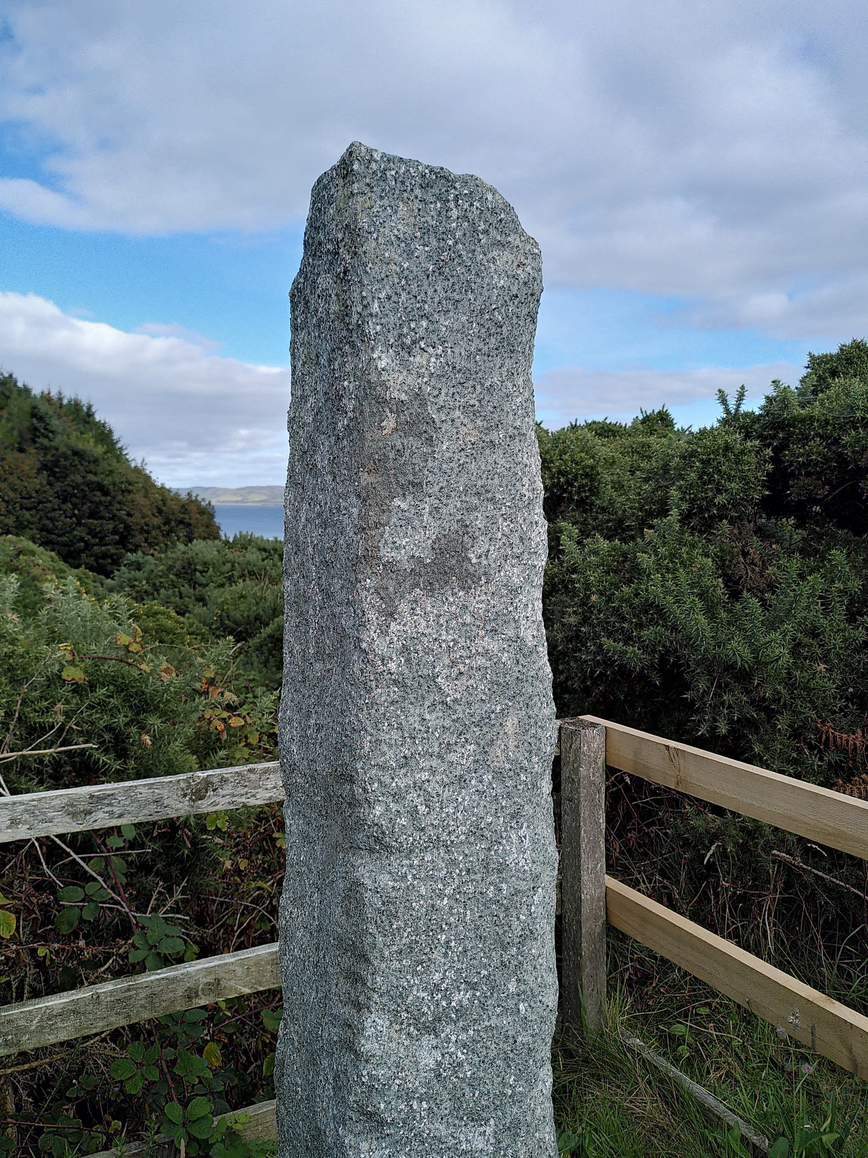 Discovery: Formerly the middle stone of a straight alignment of three stones known locally as the ‘Clocks of Gigha’. The ogham stone is located on a hillock, Cnoc na Carraigh (‘hill of the rock’), about 90 m NW of the ruined chapel of Kilchattan on the island of Gigha. Although the stone has been noted since 1695, the inscription was not noticed until 1873.