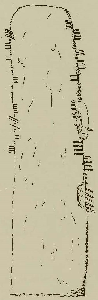 Letters: The two ogham inscriptions are chiselled and pocked. As noted by Macalister (1945, 67), the first/dexter inscription (on edge against the wall) is cut in fine lines and the second/sinister inscription (on outward facing edge) is pocked in bold scores.