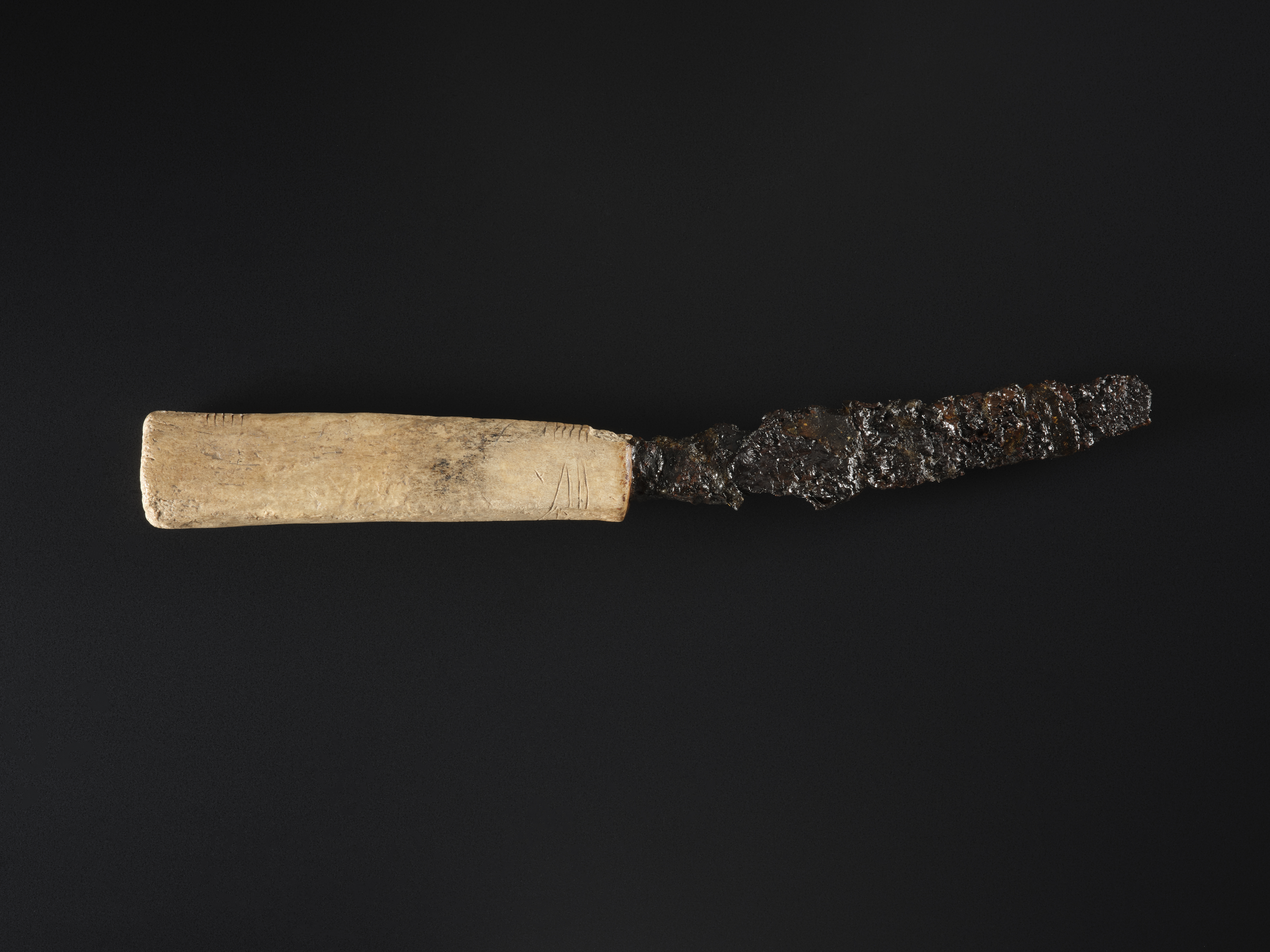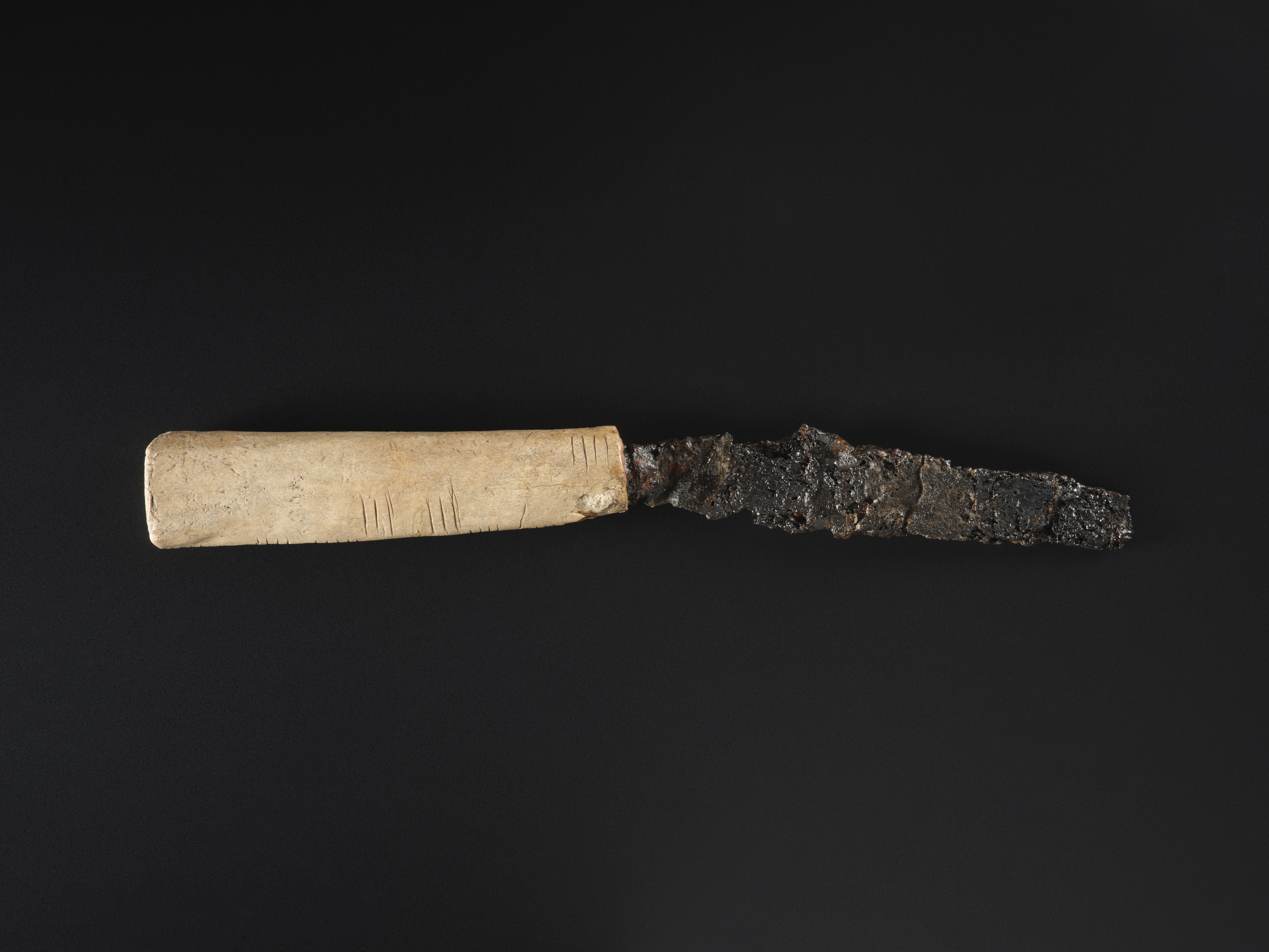 Condition: A small iron knife blade with an ogham inscribed bone handle. The blade is very corroded and broken off flush with the socket and the very tip of the blade is missing. The two lines of ogham are well-preserved and clear except for a small portion lost near the haft (Forsyth 1996, 323).