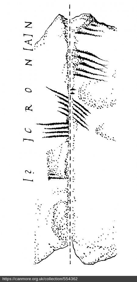 - According to Forsyth (1996, 450), ‘the letters CRON are not in doubt. Less secure are the A and N’. 2. Regarding the apparent letter A, Forsyth (1996, 449) notes that there is ‘a gap with room for a notch but no evidence of one’. Even though ‘previous writers have unanimously identified it as A. The intention, however, may be merely a blank space to differentiate between two successive letters of the B-aicme. The arris is too worn at this point to be certain’ (Forsyth 1996, 449). 3. Similarly, although ‘there is no way of knowing if the doubtful N was the last letter’ of the inscription, it is also difficult to determine this character with complete certainty (Forsyth 1996, 450). There is evidence for ‘two short strokes to the right of, and perpendicular to, the stem, with part of a third clearly visible’ (Forsyth 1996, 449). However, ‘the rest has flaked off, though slight irregularities in the residual surface may be vestiges of further strokes - V, or a subsequent member of the b-aicme: S or, perhaps most likely, N’ (Forsyth 1996, 449). 4. Additionally, there is a possibility that immediately preceding the C is the letter Q which ‘opens up the interesting prospect of the Poltalloch ogham conforming to the typical “X MAQ Y” formula, either MAQ or MAC (McManus 1991 §5.19)’ (Forsyth 1996, 450). Although, the principal objection to this hypothesis is linguistic, ‘one would expect the name to appear in the genitive case, CRONAIN’ (Forsyth 1996, 450).